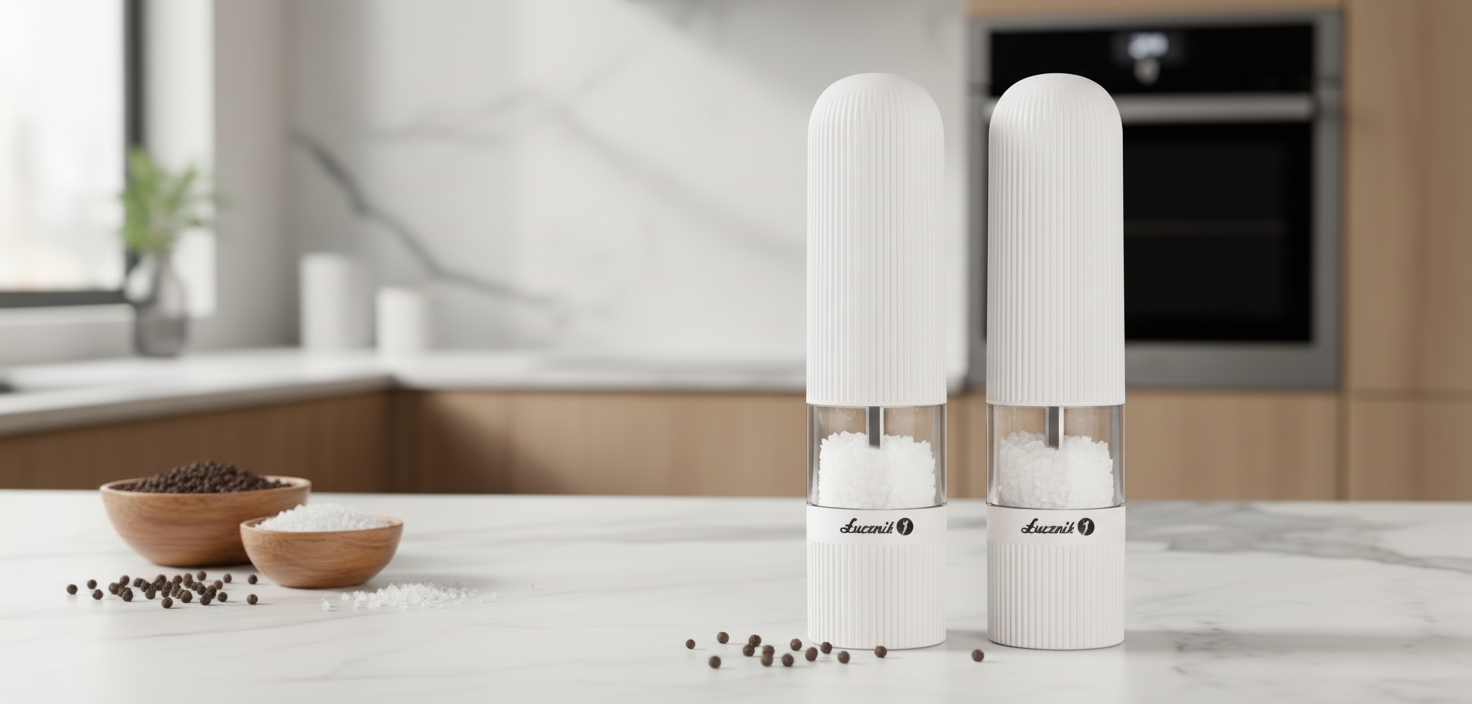 Elektrický mlýnek na sůl, pepř a koření PM101 bílý s keramickým mechanismem vybaveným možností nastavení tloušťky mletí koření.