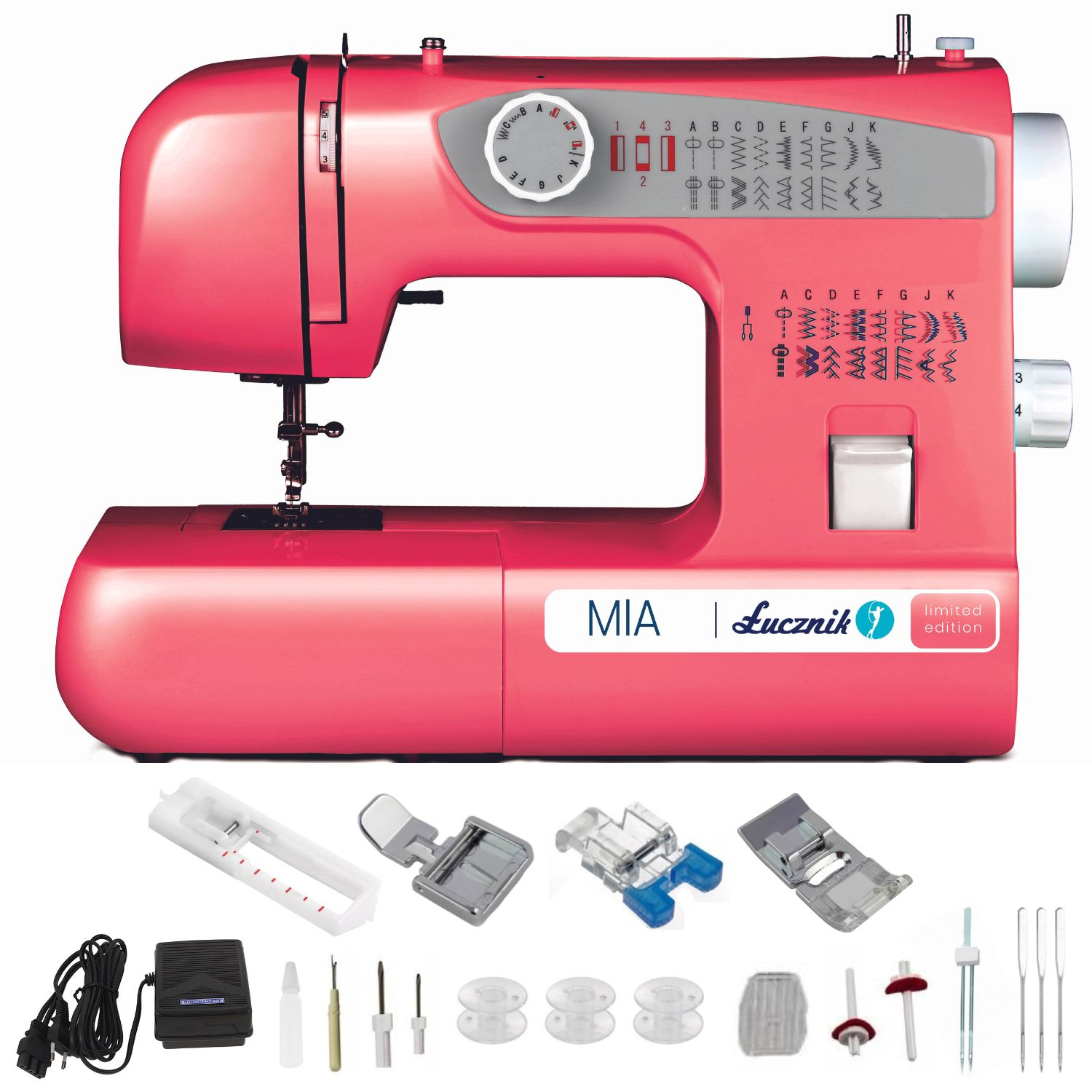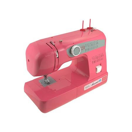 MIA má zacvakávací patky, kyvný chapač nitě a možnost šití pozpátku. Její repertoár zahrnuje základní, pružné a overlockové stehy. Má také funkci pro nastavení jejich délky.