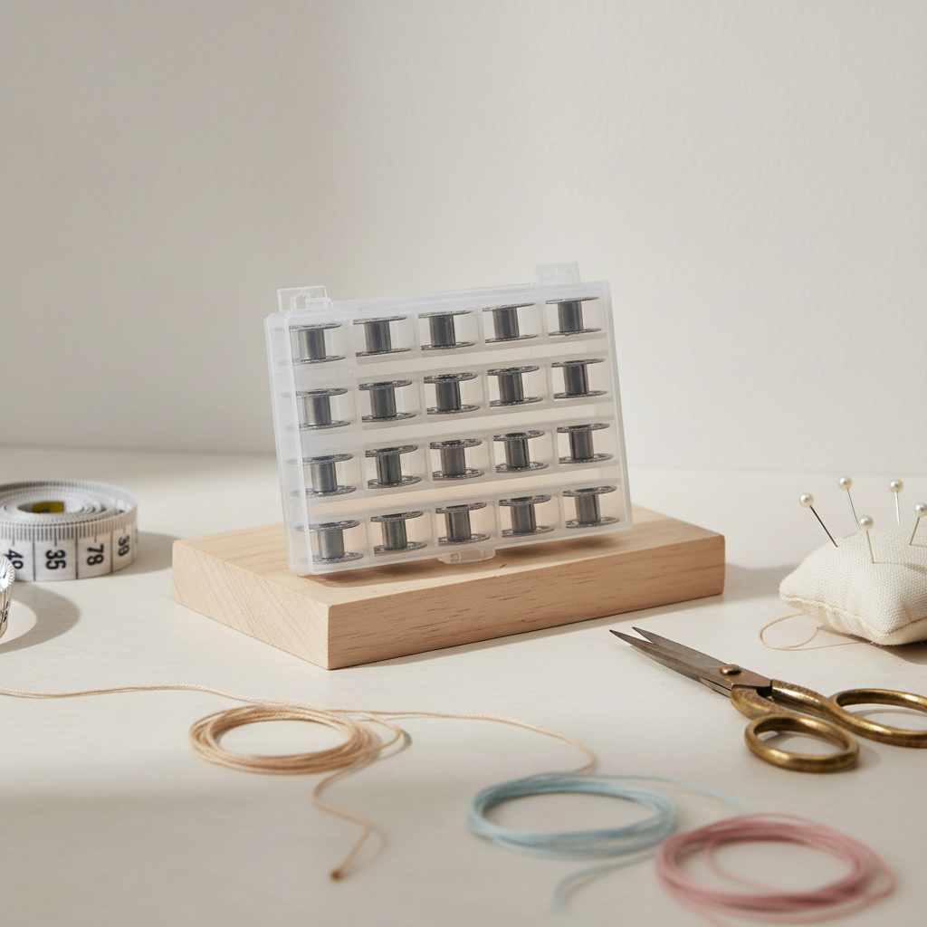 This set includes 25 machine bobbins. Their diameter is 2 cm, height is 1 cm and inner diameter is 6 mm.