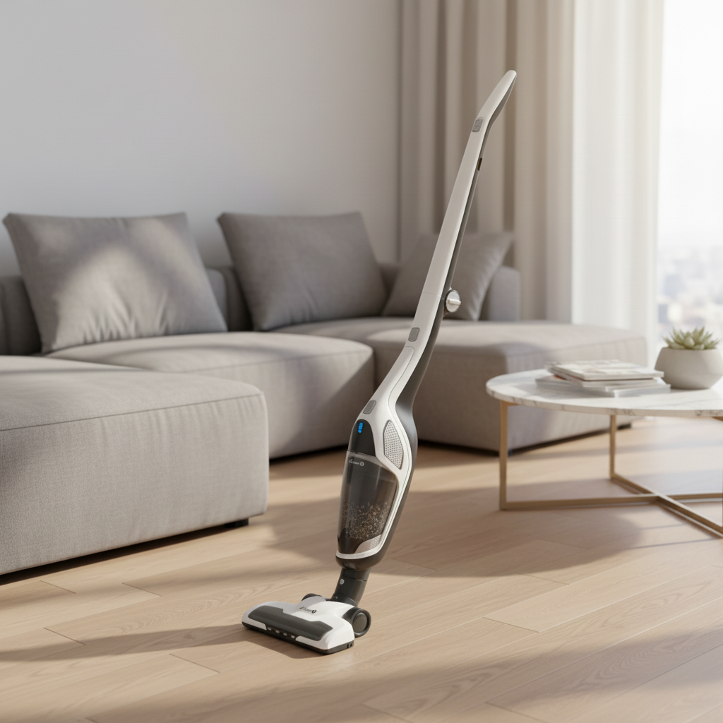 Ładowanie akumulatora odbywa się za pomocą dołączonej stacji dokującej i trwa około 4 godzin. Wbudowany wskaźnik poziomu naładowania pozwala na bieżąco kontrolować stan baterii. Po pełnym naładowaniu odkurzacz pracuje przez około 60 minut, dając Ci czas na swobodne sprzątanie całego mieszkania. W razie potrzeby możesz odłożyć sprzęt na stację, co zwiększa komfort użytkowania.