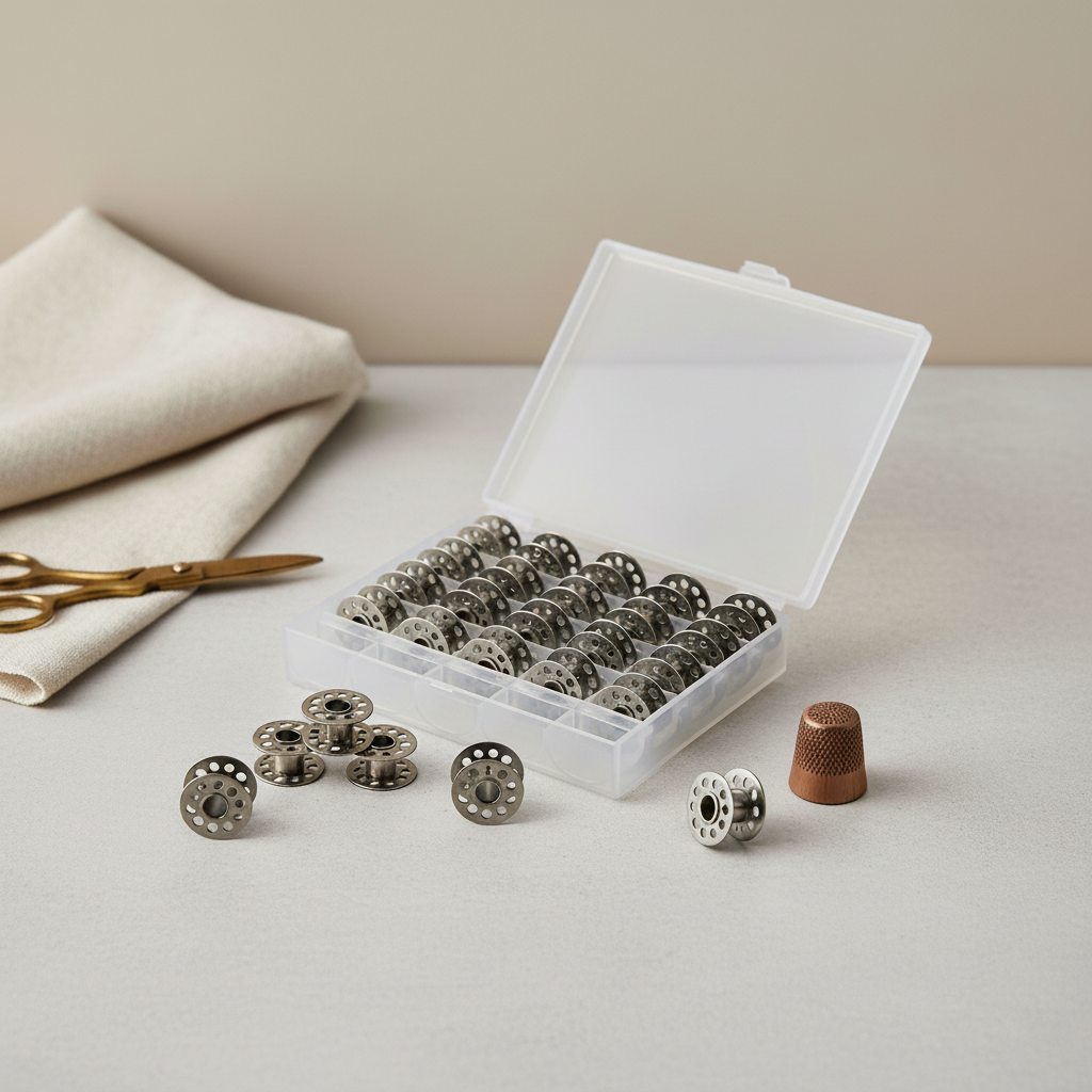 • Komplet 25 metalowych szpulek do maszyn do szycia w wygodnym pudełku. Przeznaczone do użycia tak w maszynach do szycia Łucznik, jak i wielu innych producentów.